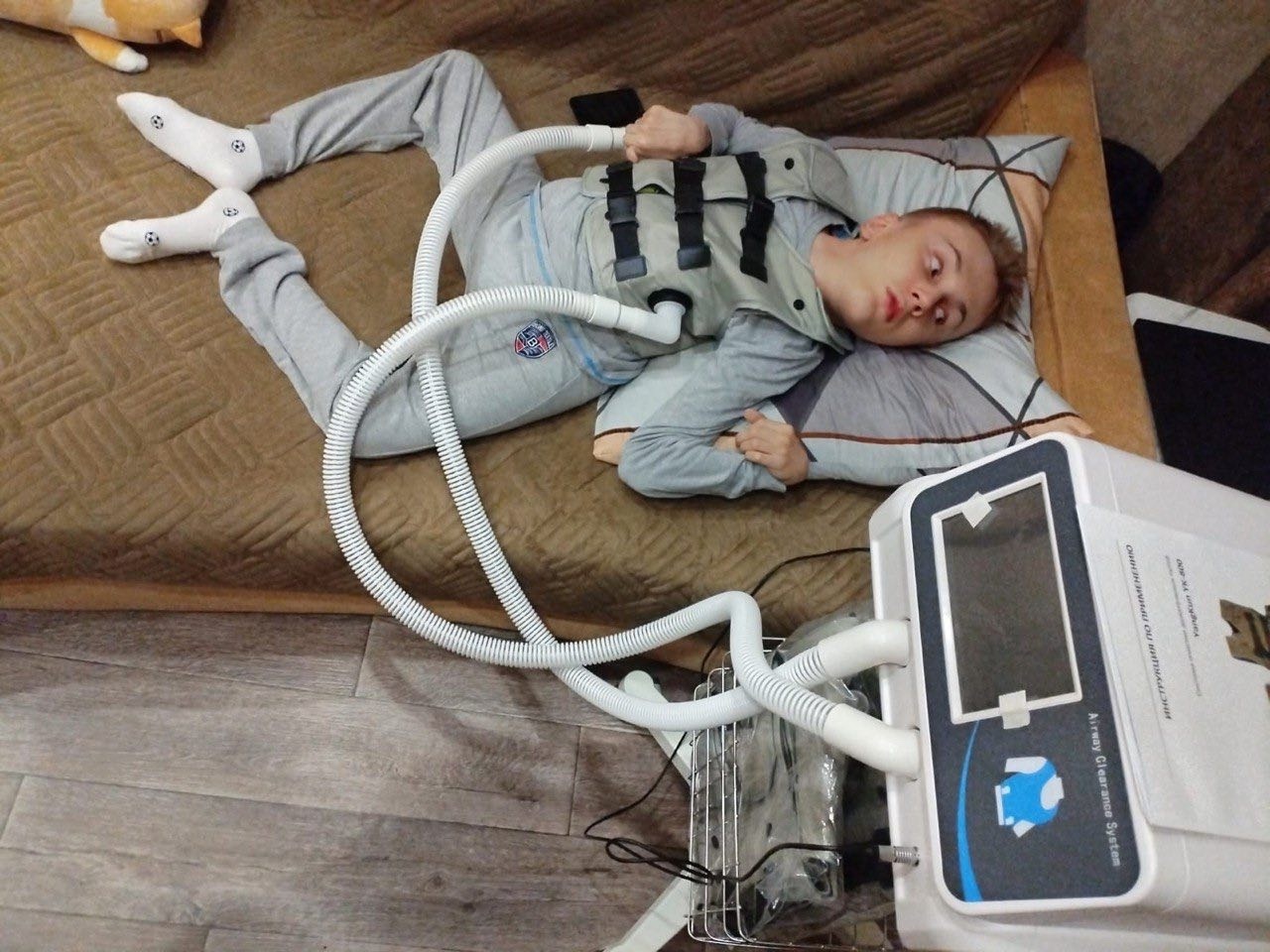 Из-за своего диагноза (ДЦП, СМА) Дремин Денис не способен к самостоятельному движению. Мокрота заполняет легкие ребёнка и свободно дышать он не может. Покупка специального пневможилета стала важнейшим шагом для улучшения качества жизни Дениса.